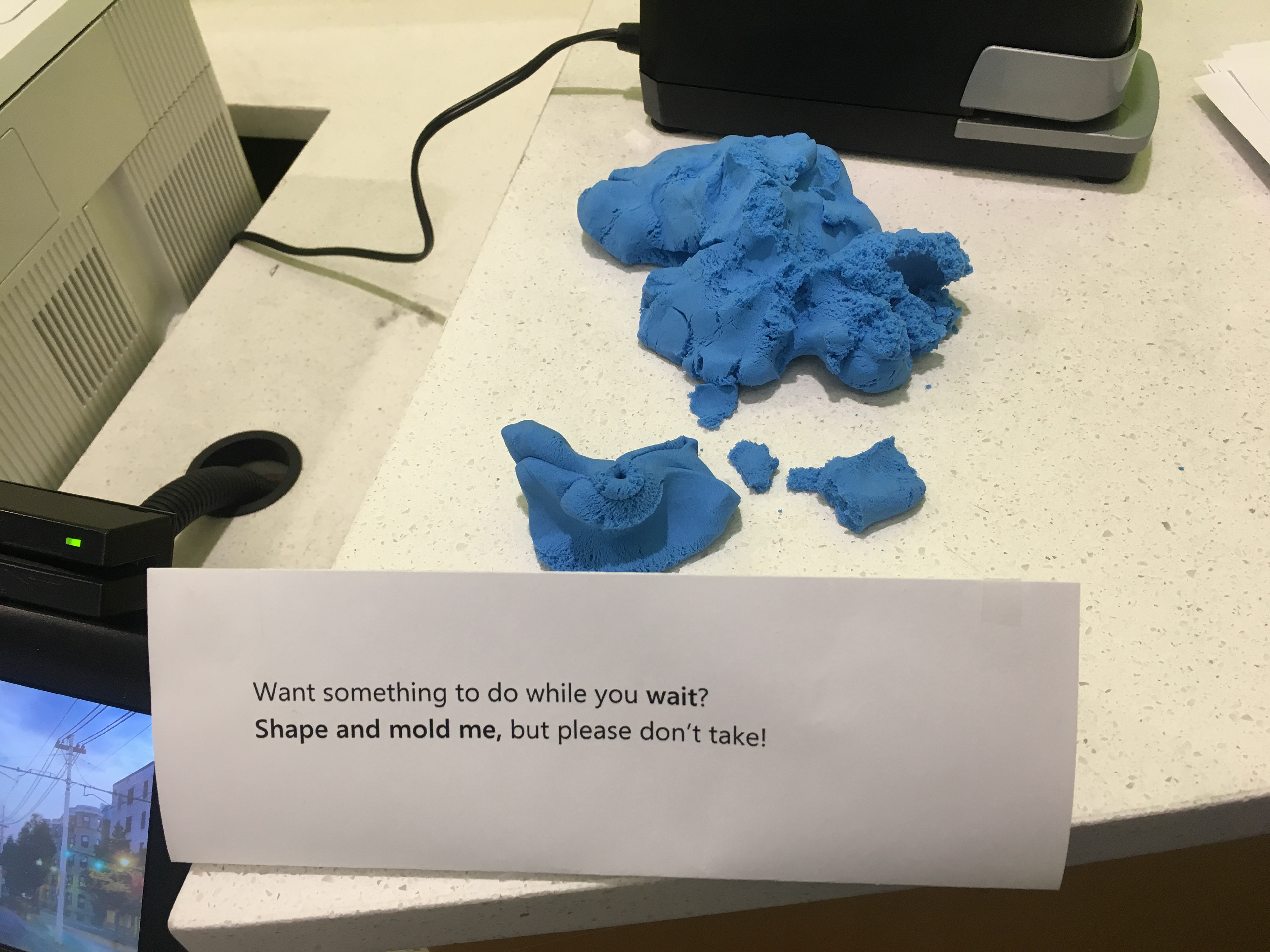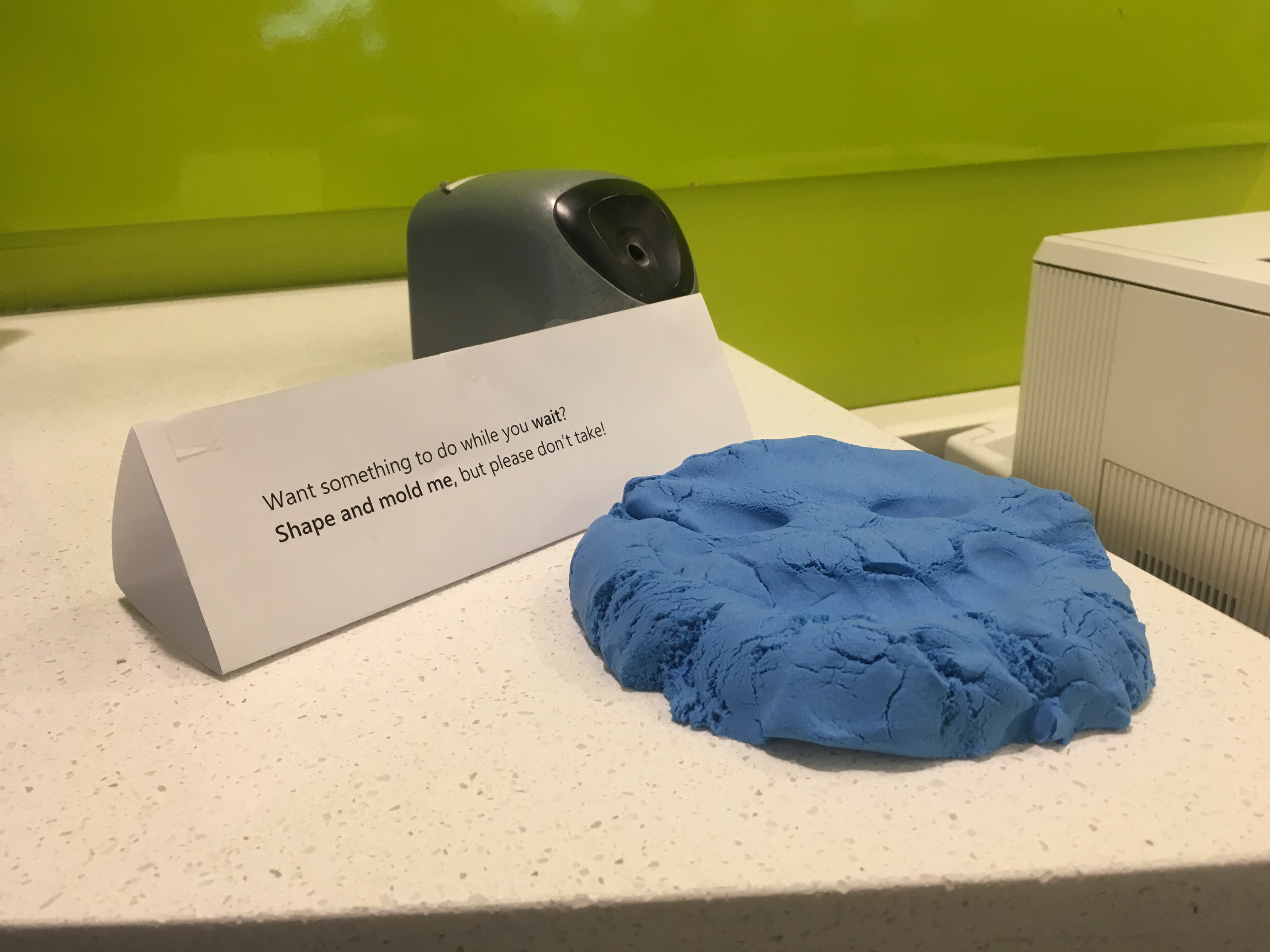 The second prototype we tested was a certain type of clay that didn’t dry out. This prototype was piled up in a mountain shape and accompanied by a sign inviting people to touch and play with it. This second prototype was tested near the printers at the library because we observed that these areas were touchpoints and stops at workplaces, so I thought it was a good idea to place them there as a way of engaging people to escape from reality for a couple of minutes while waiting for their printed documents. The insights we gained here were very interesting, specially because we observed the same kind of reaction we had from the balloons interactions when being experienced in group. We observed that some people were more curious than others and in order to further develop this interaction, I think we need to analyze and utilize other materials and colors, shapes and signage in order to compare and see which ones invite people to be more curious.